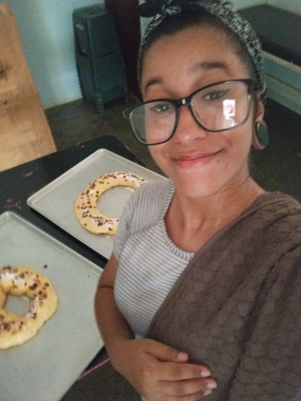 Finalmente al salir del horno las roscas quedaron así. Crecieron muchísimo y creo que lo ideal sería que las colocáramos en un molde de pastel con un agujero en el centro para que ellas no se expandieran tanto hacia los lados.