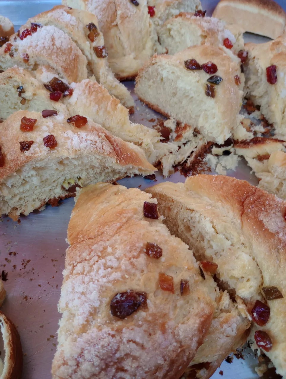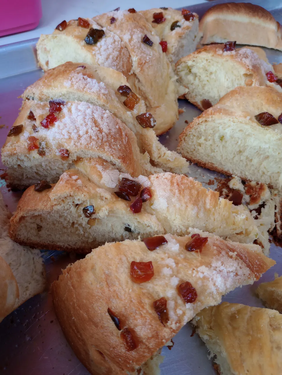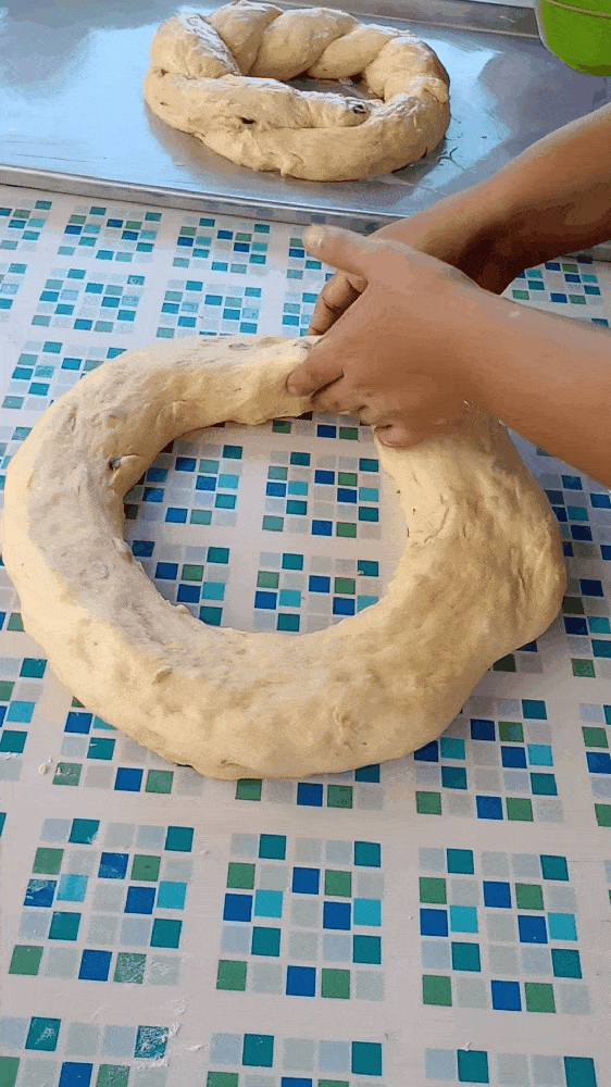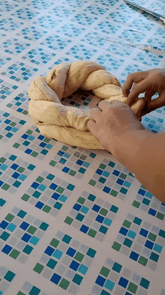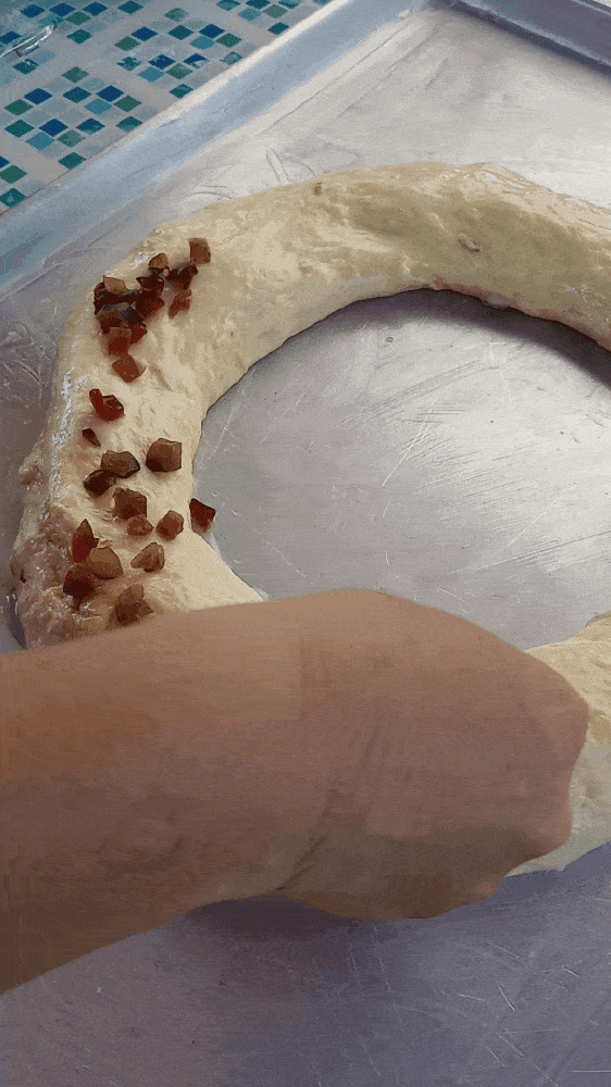 We make a circle with the braided dough and join the ends. Place on a greased tray, dip with egg and then place candied fruit and sugar on top to decorate our bread.