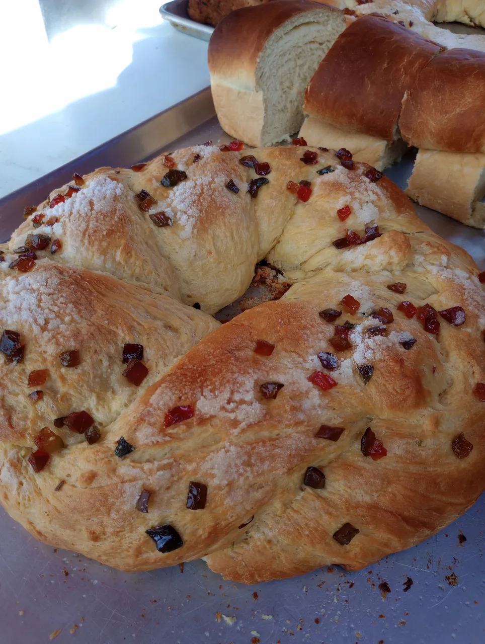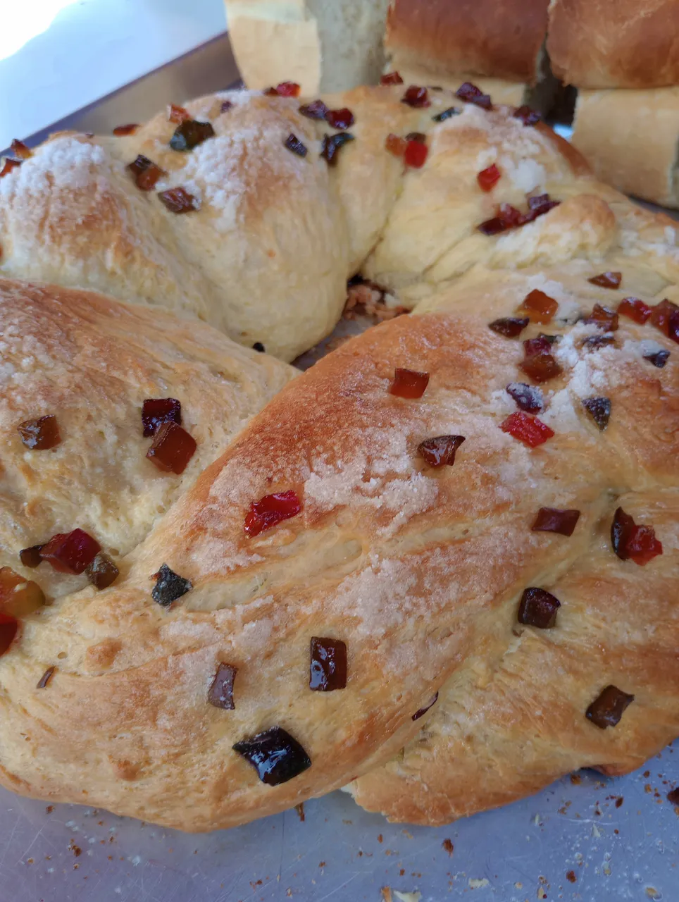 Hacemos un circulo con la masa trenzada y unimos los extremos. Colocamos sobre una bandeja engrasada, bañamos con huevo y luego colocamos frutas confitadas y azúcar en la parte superior para decorar nuestro pan.
