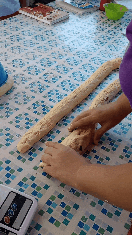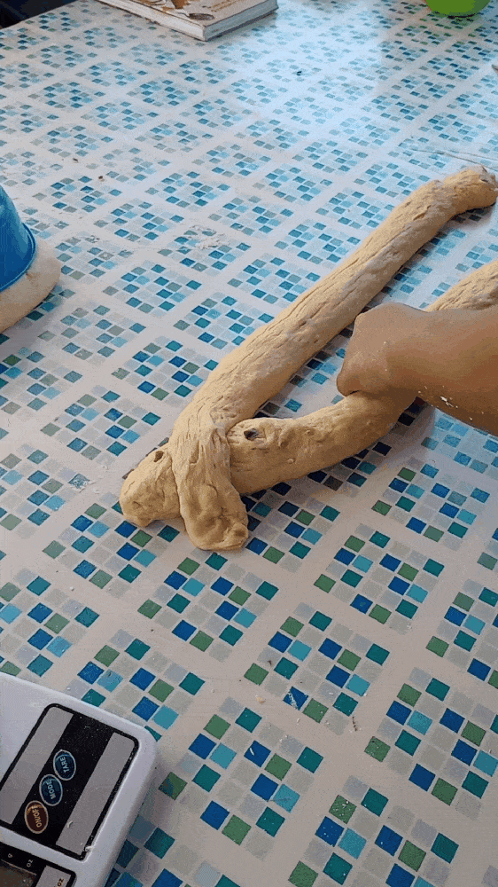 For the first presentation we will do the following: We divide the dough in half, make two cylinders and then braid them.