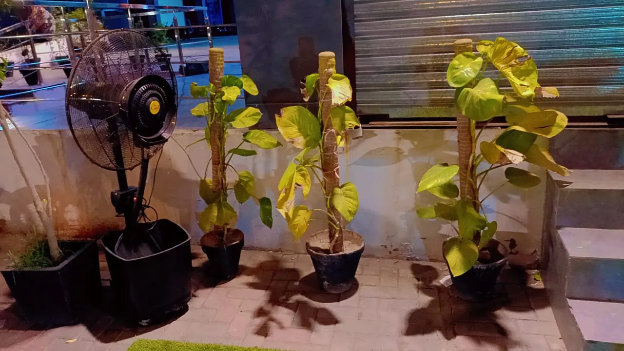 they had this fan, especially for the people who like to sit outside. Near the fan, there were these plants. They were giving very beautiful looks and were making the place look more beautiful.