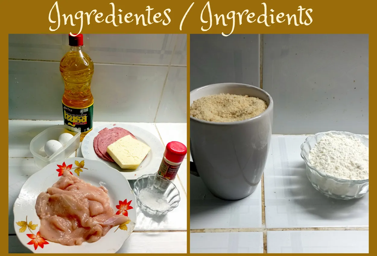 To start, I seasoned the breast fillets with salt and pepper. Since I had them very thin, I grated the white cheese to make it easier to roll them up. Next, I took half of the ham slices, placed them on top of each breast fillet and sprinkled the grated cheese on top. One by one, I rolled the fillets, making sure that the filling was well wrapped.