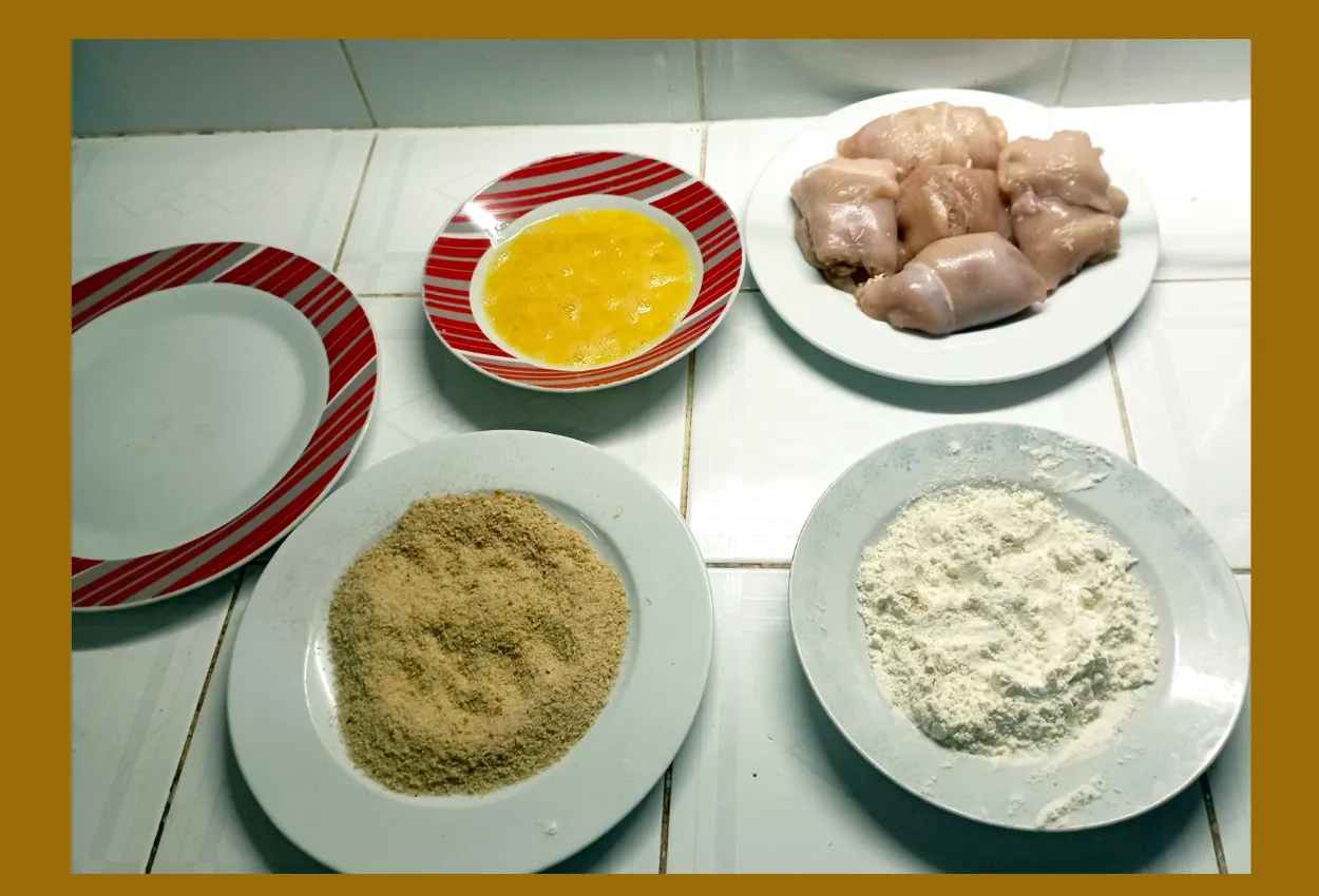 A continuación, pasé los rollitos por harina de trigo, los sumergí en huevo batido y, por último, los rebocé en harina de pan para obtener una textura crujiente y dorada.