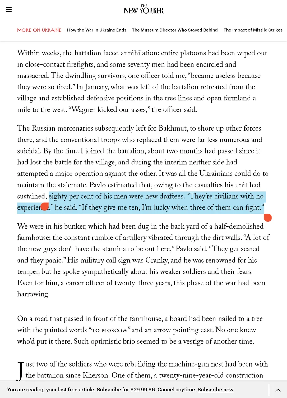Western Media for the past month has been steadily leaking little bits of truth from the front in Ukraine. In a recent article from this week, by a New Yorker magazine reporter embedded with AFU troops on the Bakhmut front we learn about the dismal lack of support, training and equipment the Ukranazi face: