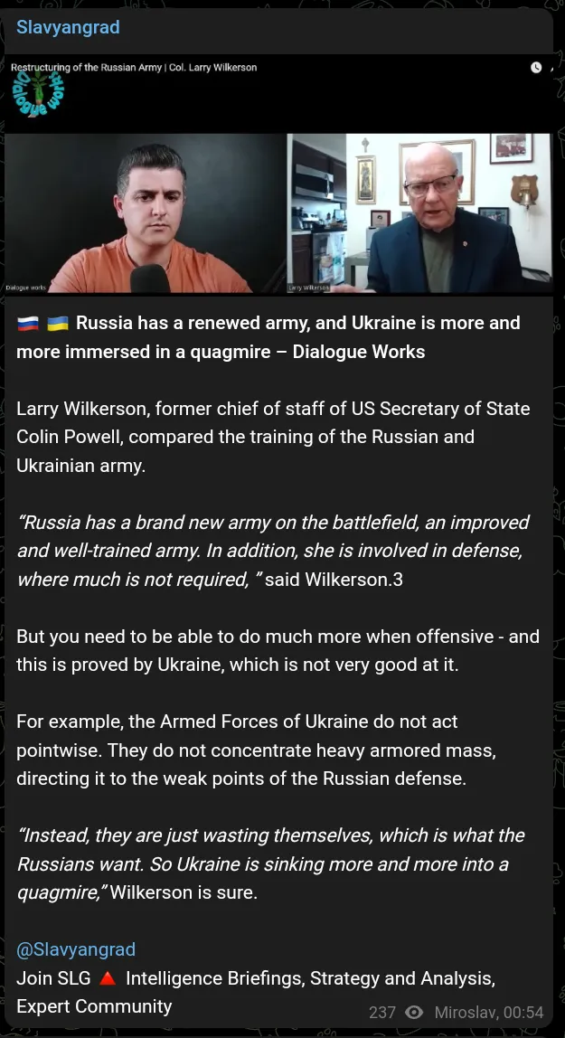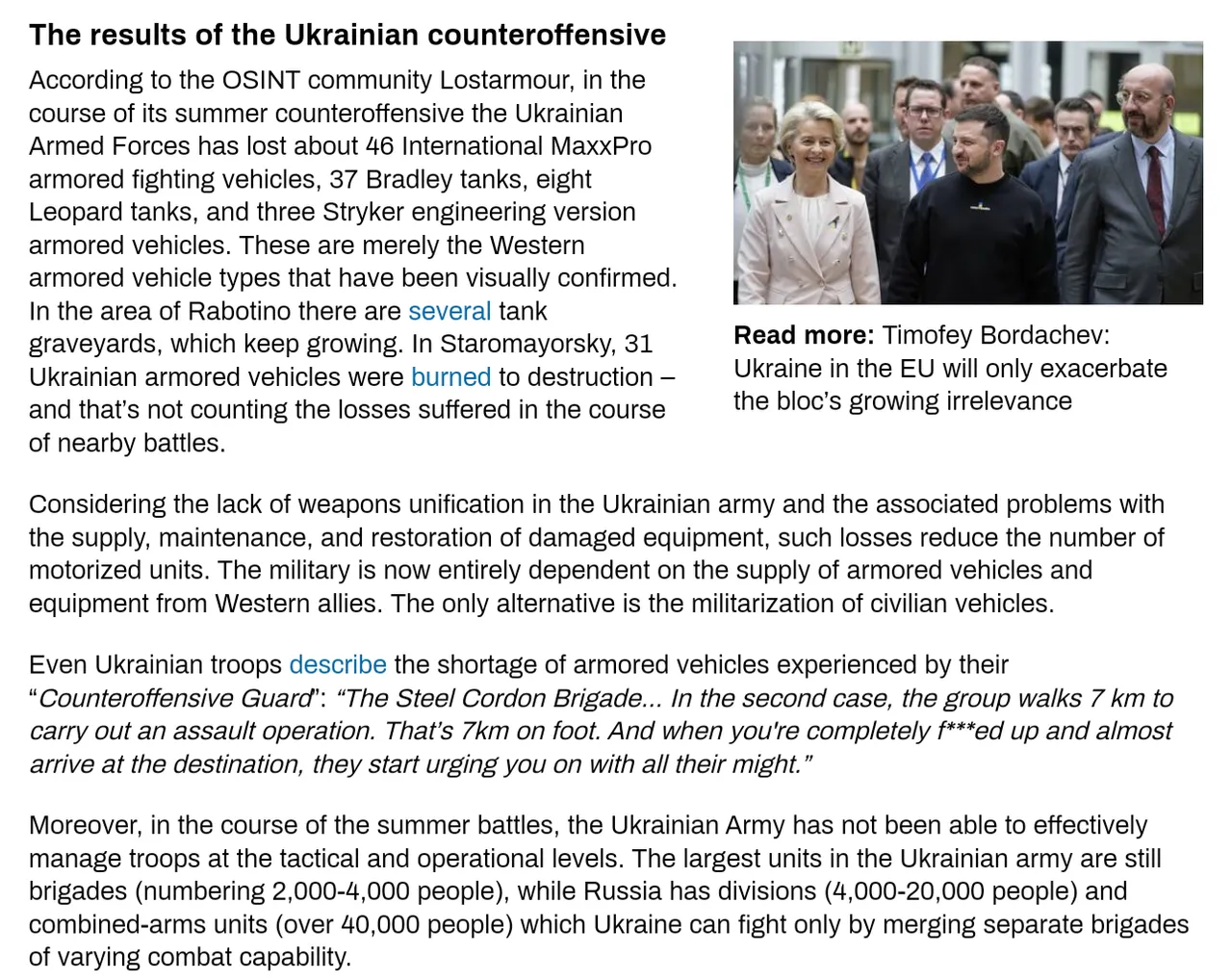 “The human losses on the Ukrainian side are huge, Western equipment is burning like matches, it is much worse than they usually imagine,” Vysotsky said.