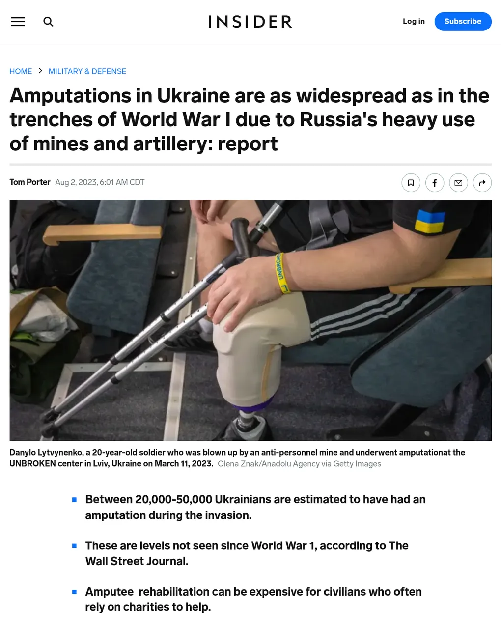 I'd say that the WIA to Amputee ratio is 1:30 or 40 because of the ones lost to improper first aid and the ghouls who traffic their organs, and the KIA to WIA is then closer to 1:2, thus at the minimum I'd say 600k-800k WIA and 300k to 400k KIA, making the low estimate (20k amputee) 900k-1.2 million total casualties and considering that they mobilized over 1 million and started with 380k it corresponds with the desperation for conscription of 17yo and those who fleed which obviously is scrapping the bottom of the barrel, here's the Butcher himself from earlier this week: