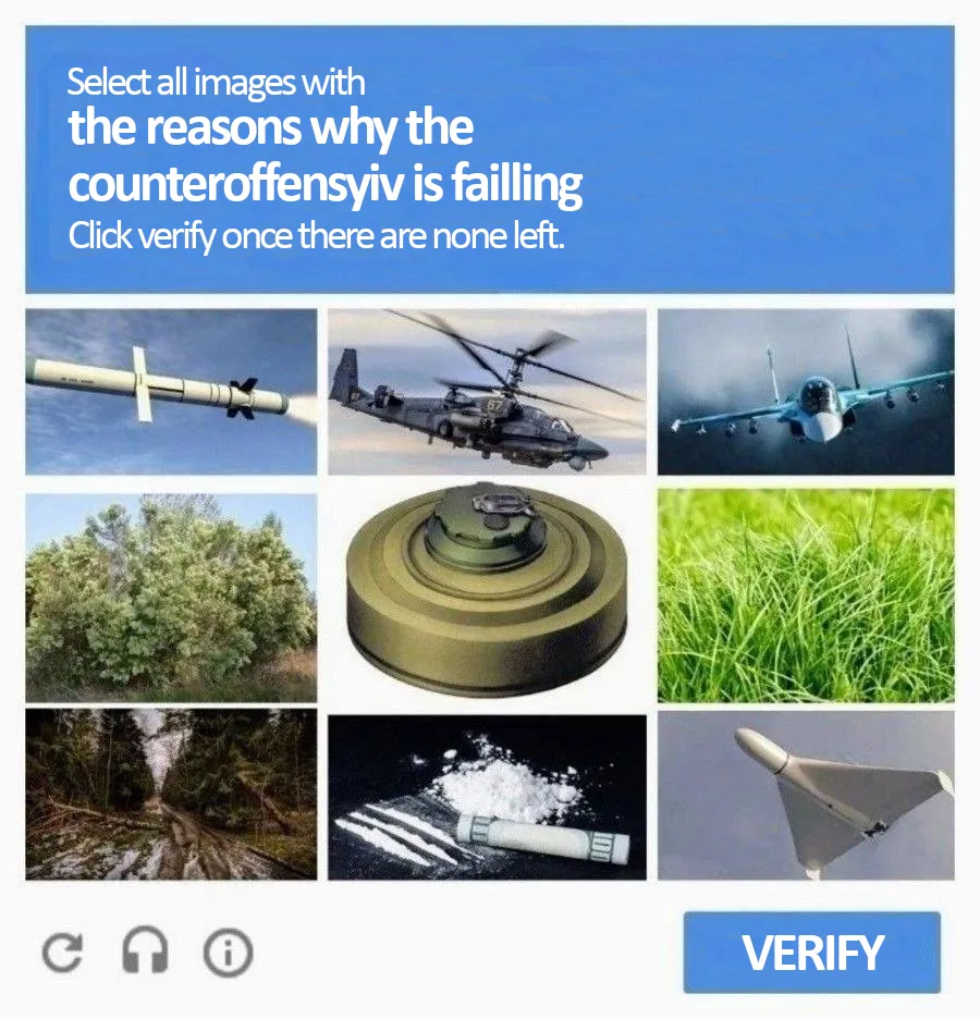 Be Retard, Brag about your counteroffensive "as soon as the ground freezes", tell everyone that as soon as spring comes you'll launch your counteroffensive, boast that when the ground dries you'll launch your assault, make promotional video for your counteroffensive, make expectations of unmitigated success, launch your much anticipated offensive, fail at achieving anything and say the offensive hasn't started, it's only shaping operations, announce that you're changing strategy after announcing that the offensive is on pause, make cartoons blaming your donors and supporters for your success, announce main thrust and promise increased pace of the offensive, fail at achieving anything, throw in the reserves earmarked for exploiting the planned breach to instead try and take a village in the screening zone, fail at capturing one hill or the single village, get mad and tell everyone to shut up about the Counter-Offensive: