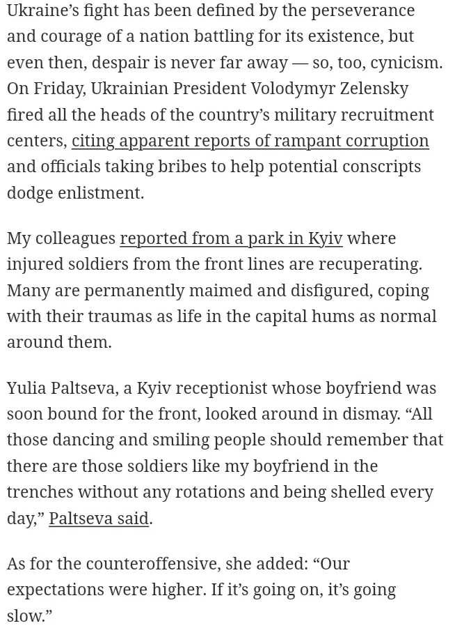 As I said at the beginning of this news roundup, desperation is the mood, and this is by their own admission, either outright like above, or implicit, and the Washington Post is on a roll, this following article was from 4 days ago, lots of doomer Ukrainians in that article which can be quoted and categorized as Regret/Despair and Cynicism, I mean look at the title: