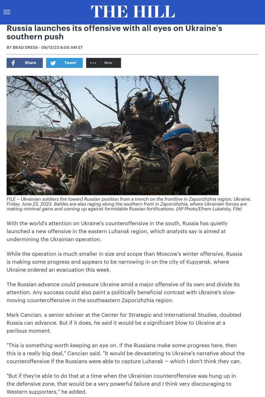 Some of the gains they break the "news" on as they try and spin them as "if", have been confirmed almost two months ago, and the most recent ones around Kupyansk are over a week old, meanwhile they make no mention of the more impressive and significant gains where the Russians crossed the Zerebrerzi River and have advanced more in two weeks than Ukraine has advanced in the entire month of July.