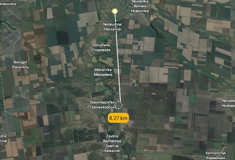 Measuring the distance at 8 km, so over two months of offensive and they are not even half way to the first line of defense, seen on the ISW map as the triangles(Russian field fortifications).