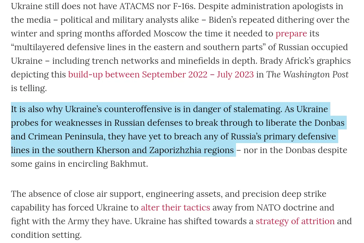 It must be pointed out that Ukraine hasn't even reached the dragons teeth or concrete fortifications, they have been bogged down in the security zone by mines and have barely reached the first defensive line in one place, and haven't had any success breaching it. They continue: