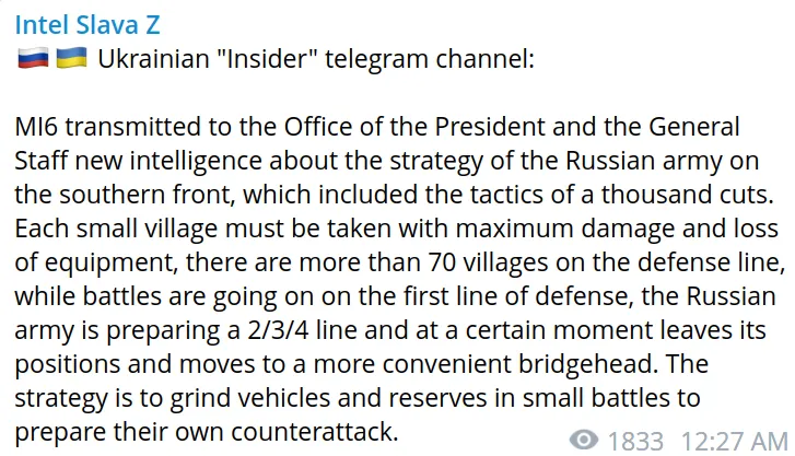 “On the contrary, the Russian army delivers between 20 and 50 “new” or modernized main battle tanks to Ukraine every month. The logic behind this is simple: if Ukraine loses 10 to 30 Western armored personnel carriers per village, and few new ones arrive, its advance will stop before reaching strategically important cities such as Tokmok, Pology, Melitpol, Volnovakha or Mariupol.