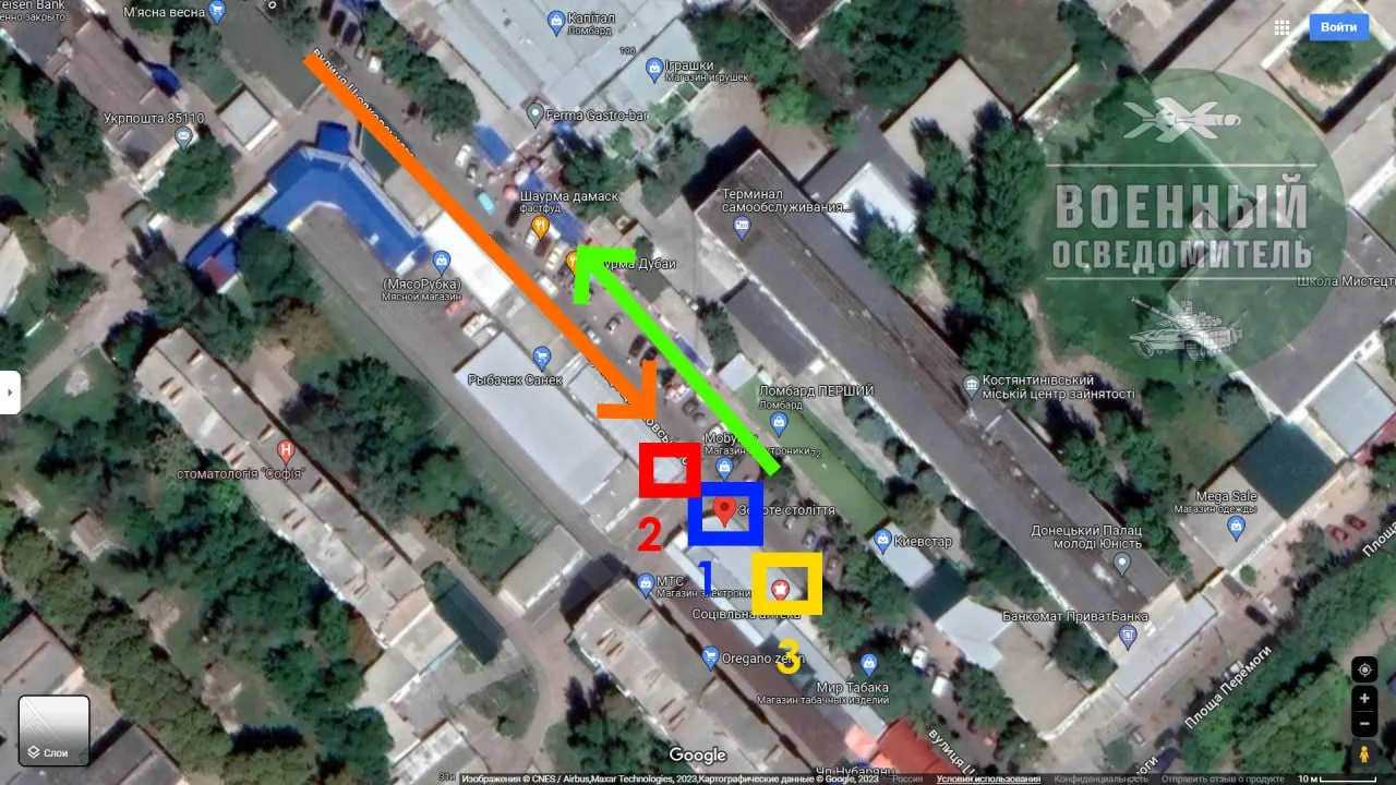 As can be seen in the video, a second before the arrival, local residents look into the sky in the direction of Druzhkovka controlled by the AFU (marked in green), from where the object is flying (marked in orange), after which there is an aerial explosion near the "Golden Century", which is not typical for an ordinary rocket, shell or aerial bomb, but is typical for an anti-aircraft or anti-radar missile.