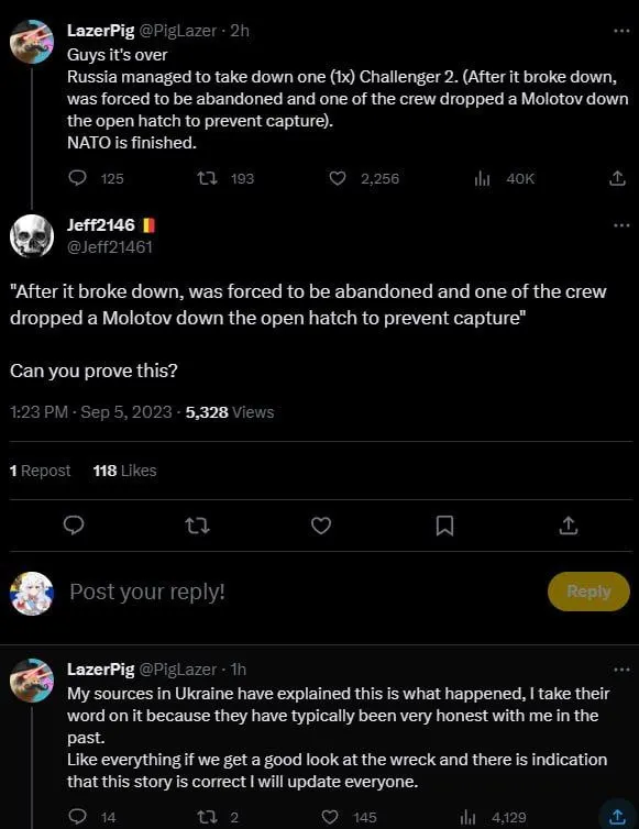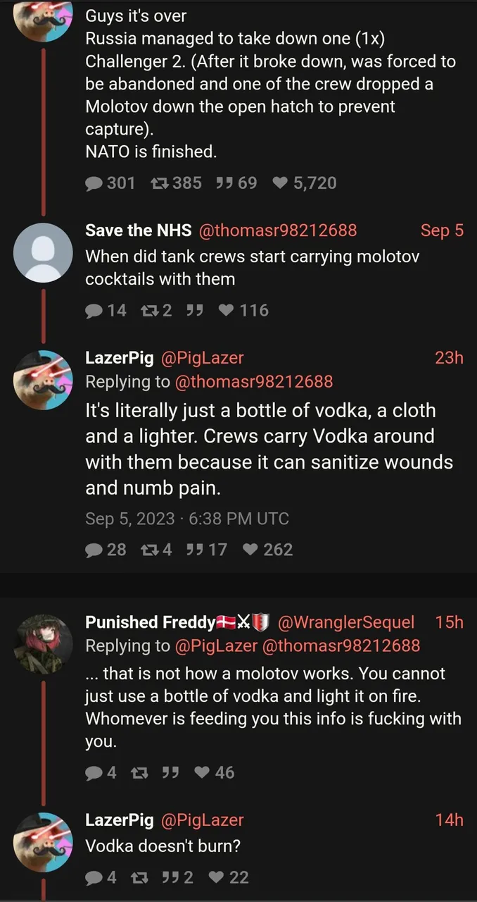 Shapp's account differs from another version offered by sources to The Guardian indicating the lost Challenger 2 had hit a mine which detonated rear fuel stores on the vehicle. In this account, the tank was then hit by a Lancet-3 kamikaze drone. Both sides frequently employ drones to finish off immobilized vehicles before they can be recovered.