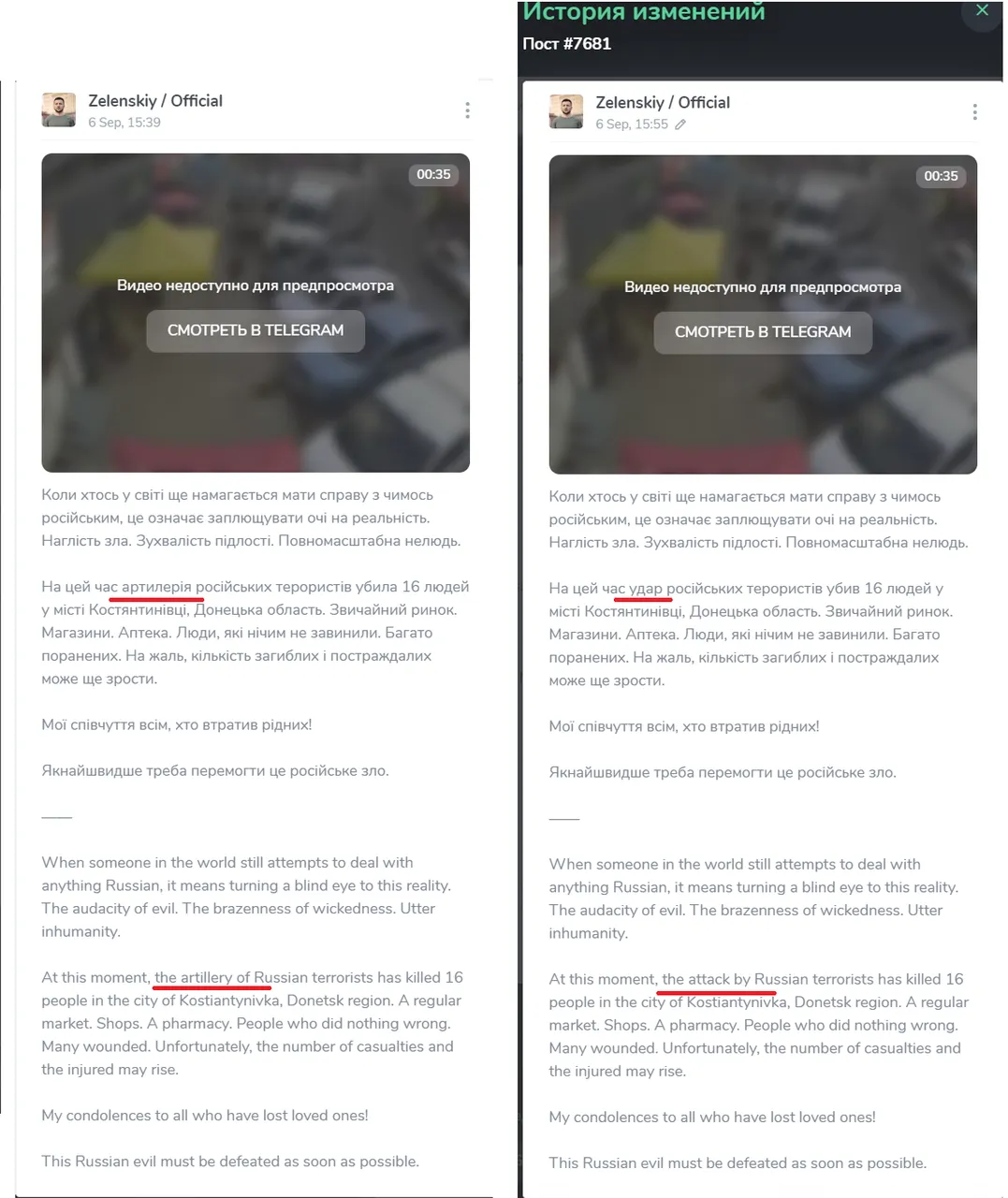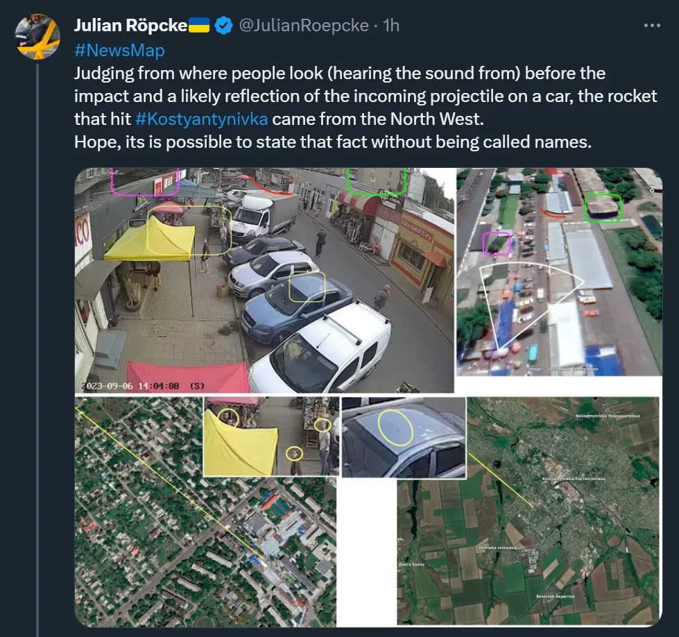Dima from Military Summary also provides the evidence that Queef is behind the strike on civilians in Konstantinovka, both by the video of the two people reacting to what appears the sound of the missile flying from the northwest right before the strike and from the video showing the reflection of the missile on the roof of a car but also he brings another detail that I haven't seen elsewhere as he shares a post from a Russian OSINT channel that claimed the Ukranazi were launching storm shadows in the area, the post was published at the same time the video timestamped the explosion at, at the minute: