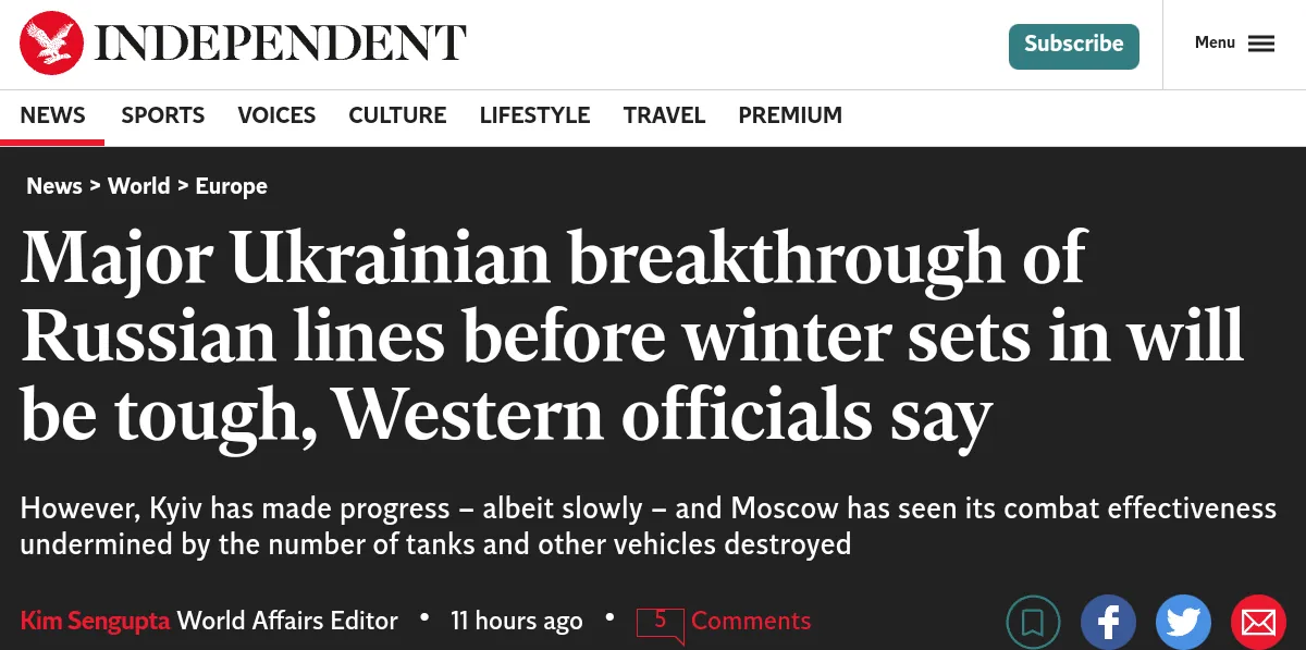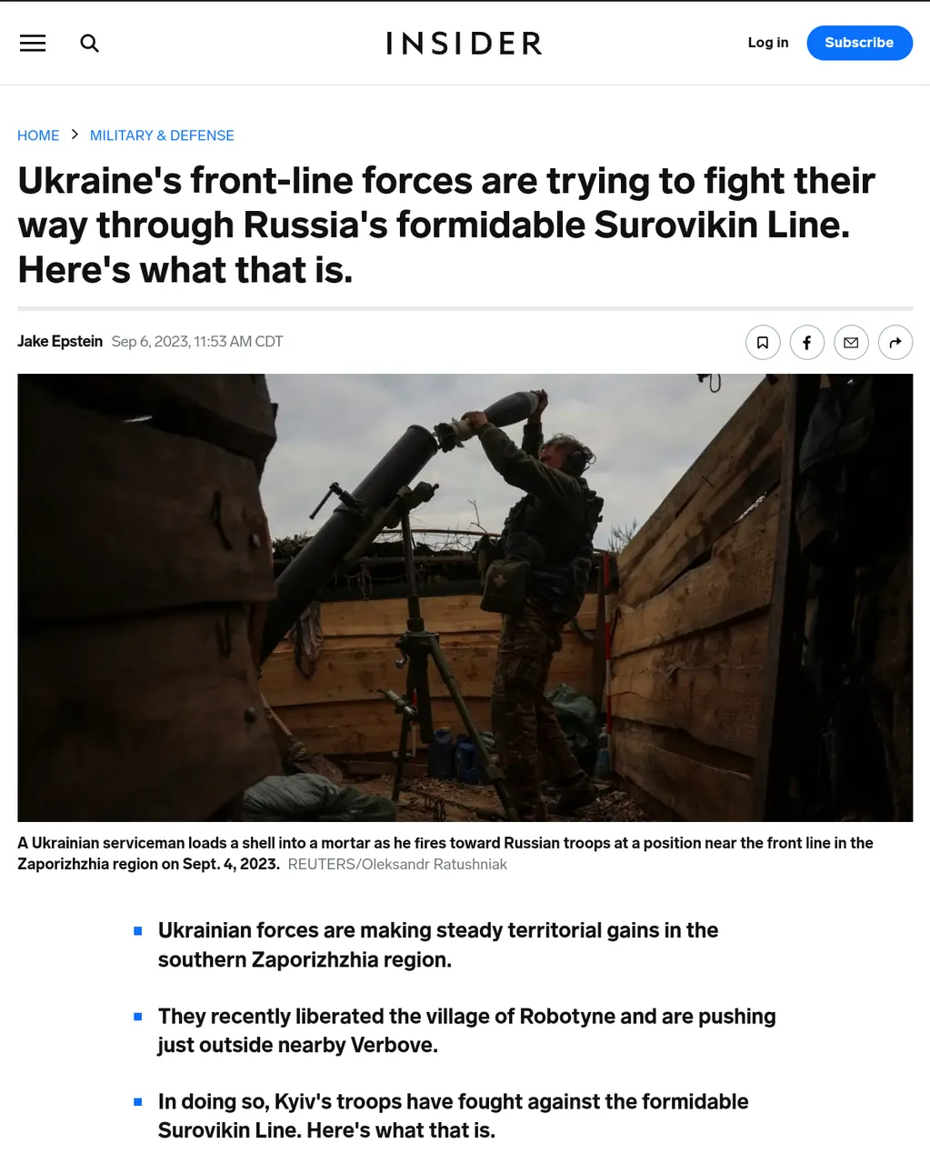 They broke through the second line, but if they didn't even breakthrough this year, holding the grayzone Rabotino and the killzone/firepocket "salient" surrounded on three sides by Russians until next spring counteroinkfense makes them "well placed". So whatever happened with one to three weeks to Sea of Azov, greatest counteroffensive 2023? O yeah, it transitioned into the "shaping" for the greatest counteroffensive 2024 and identifies as a body modification artist.