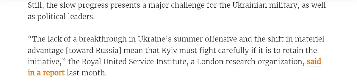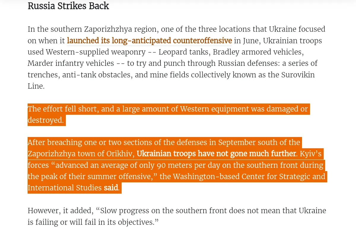 They whine that all that hard combat for 5 months hasn't given Kivv many "telegeneic images" To Show Western "Leaders", but I think what they're really bummed out for is that the internet has been flooded with high definition nato equipment bonfires. They also invoke the "Soon they'll break through" and resort to inflating the distance they advanced in Rabotino from 7 miles at the most, to now "barely 10 miles from where they started", the End is especially hilarious: