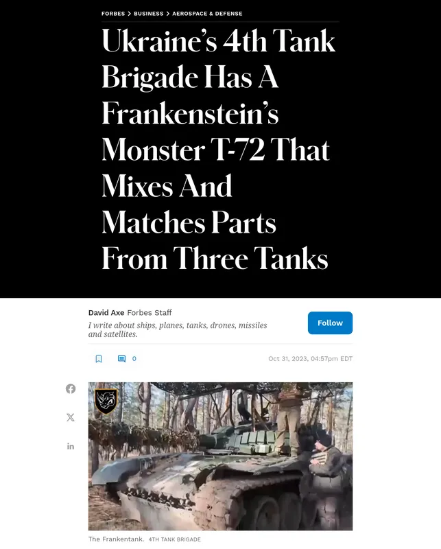 https://www.forbes.com/sites/davidaxe/2023/10/31/ukraines-4th-tank-brigade-has-a-frankensteins-monster-t-72-that-mixes-and-matches-parts-from-three-tanks/