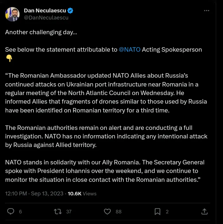 NATO sees nothing wrong with Russian drone falling on NATO Romania: