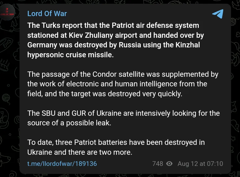 According to Turkish information resources, citing intelligence information, Patriot air defense systems were based in the mentioned air harbor, transferred to the Armed Forces of Ukraine by the German authorities. Therefore, they assumed that the specified anti-aircraft missile systems, which were the basis of the Ukrainian air defense system in this direction, guarding the sky over the capital of Ukraine, became the targets of Russian long-range, powerful and precision-guided munitions.