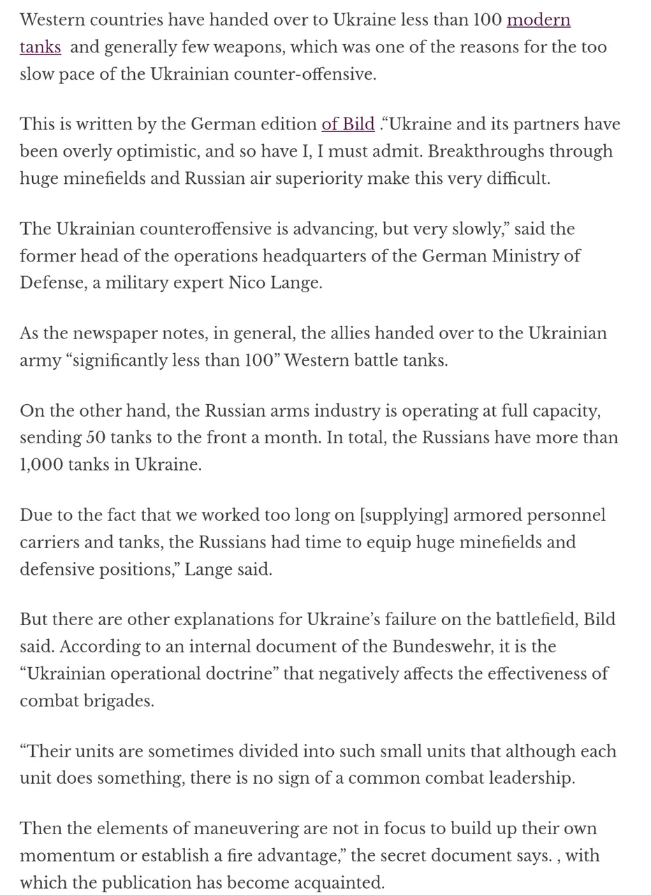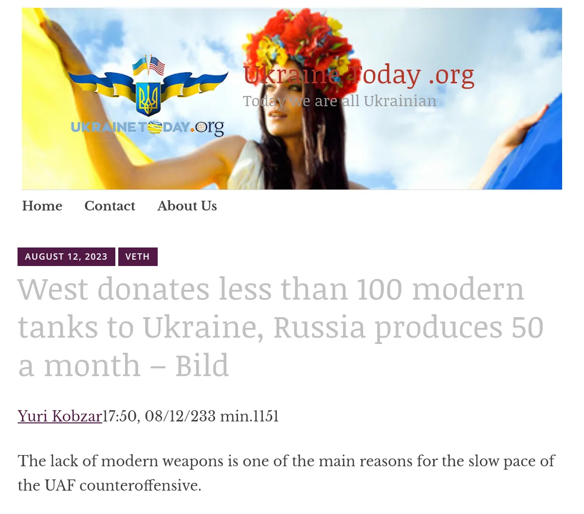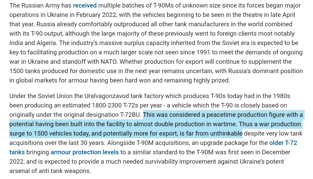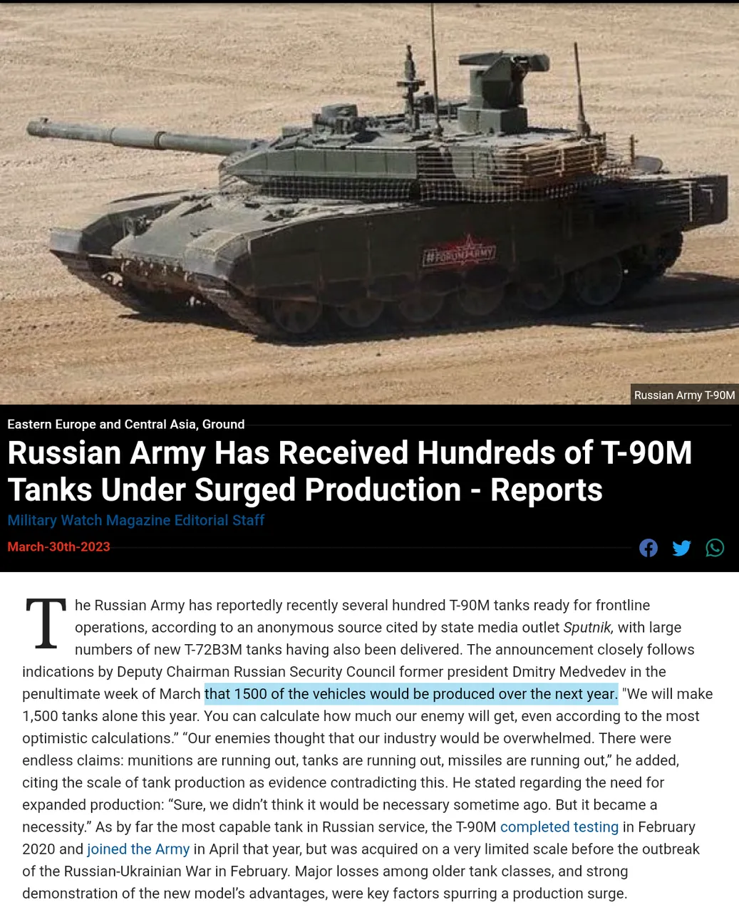 That's not including the hundreds of older tanks each month that are modernized, the other claim that is very suspect is that they have "over 1000 tanks in Ukraine" which tries to avoid putting any emphasis on a ballpark number even, and frames it as "at least 1000”, yet considering that Kivv claimed a few weeks ago that Russia has accumulated at least 900 tanks in the east around Kupyansk, which accounts for not even a quarter of the entire front, I think it's safe to assume they have at least 3-4 times that.