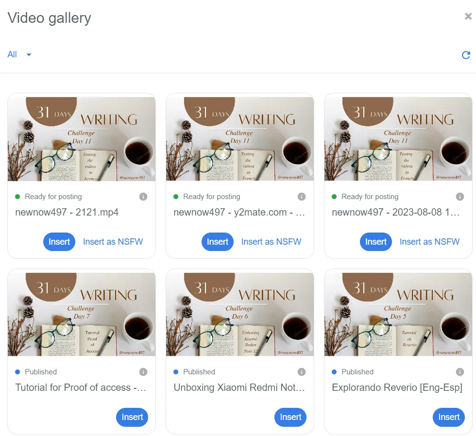 When the encoding is finished, it goes to the Ready for posting state, where we only have to touch the Insert button and the video code is placed in the post.