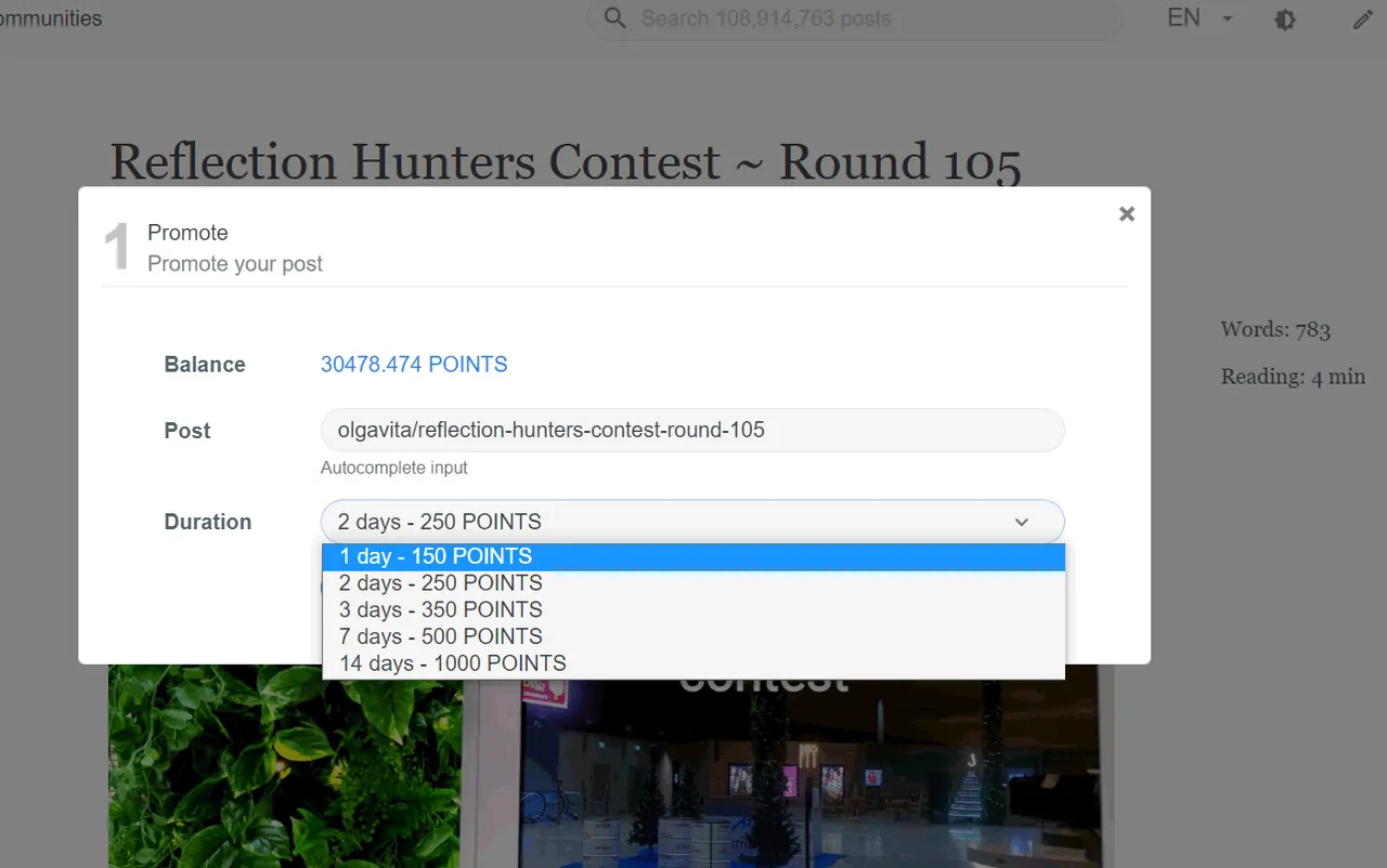 We will see a Promote pop-up window. Here we can see how many POINTS we have in our wallet, the link to the post we want to promote and a drop-down menu where we can choose how long the promotion should last. From 1-14 days. Choose the time. Click.