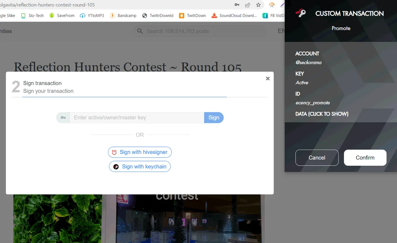 A Hive Keychain pop-up window appears on the right-hand side, with the details of the transaction that will go to the blockchain (where it will be validated by the miners or, in the case of Hive, by the Hive witnesses), and we confirm the transaction.