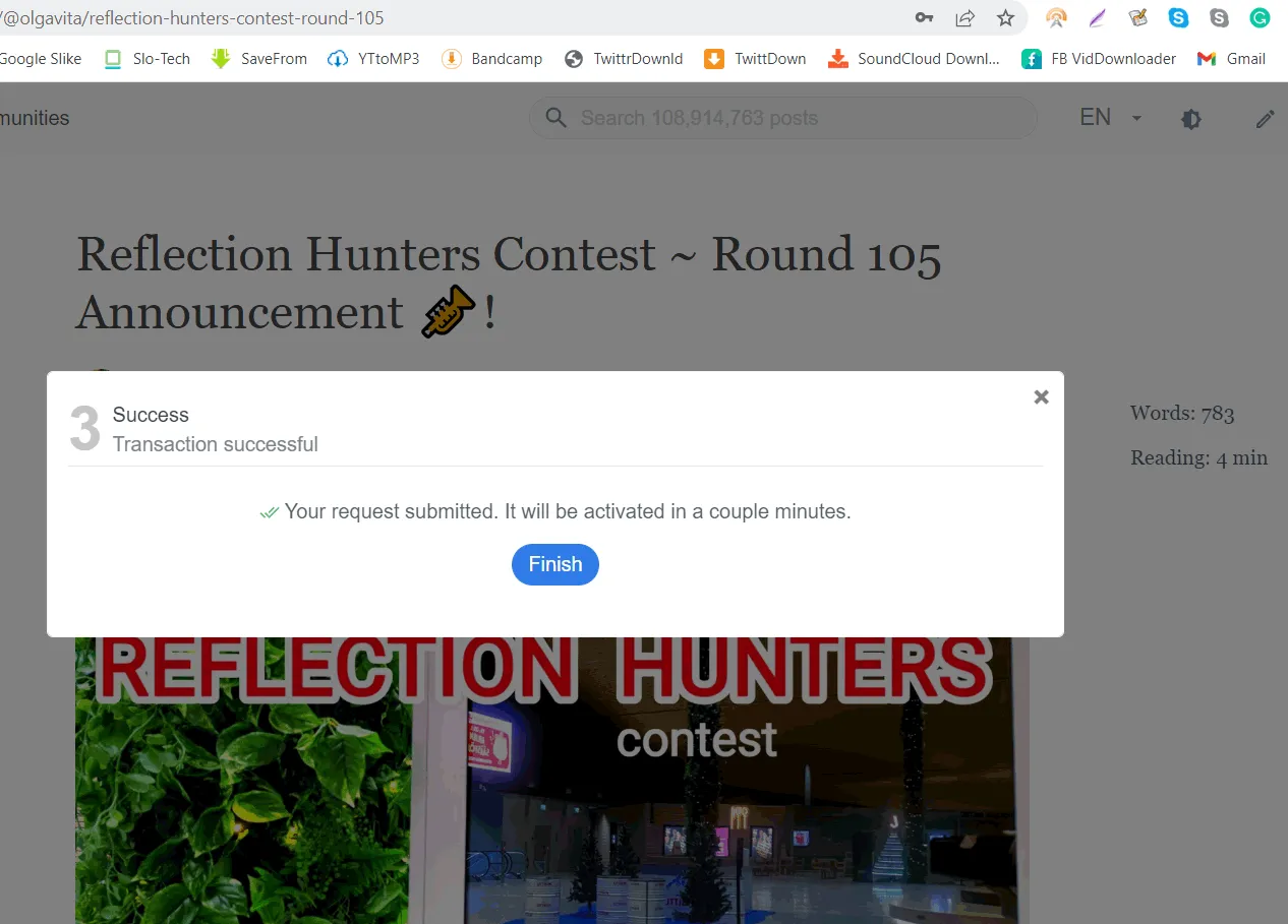 After our confirmation, the Hive Keychain window closes and a pop-up notification remains in the browser that the request has been sent and will be activated in a few minutes.