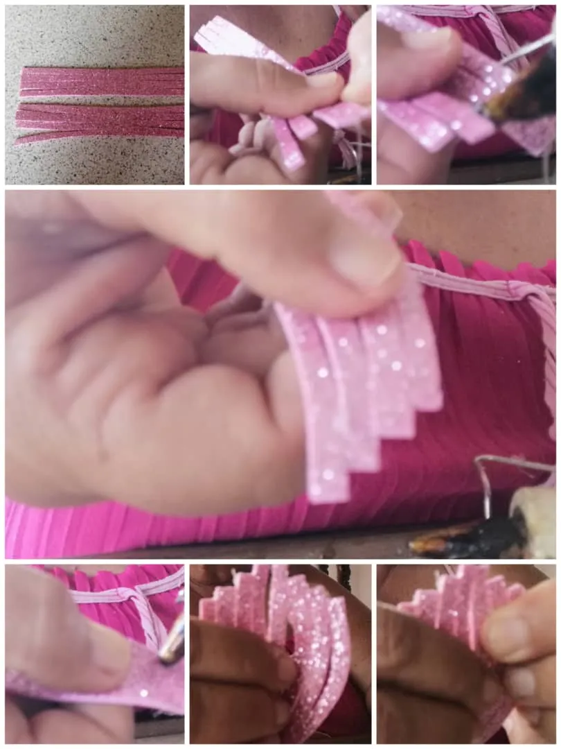 Echo esto se empieza a pegar cada tira de las cortadas un lado de derecha a izquierda y el otro lado de izquierda a derecha esto para que el centro quede del mismo largo, queda como en escalones, echo esto se unen en el medio, se le echa silicon en el medio por el lado derecho en la parte de arriba y por el revés se corta por un extremo en forma diagonal, esto se hace en las dos tiras.