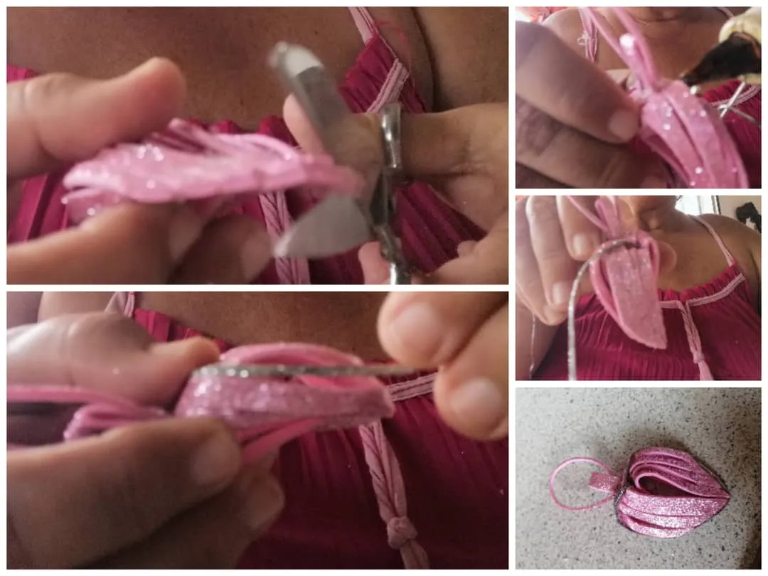 Se corta una tira de 2 centímetros de ancho por 5 centímetros de largo y una de medio centímetro de ancho por 14 centímetros de largo esto es para hacer por donde se cuelga. En la cinta pequeña se echa silicon en uno de los bordes y se pegan los extremos de la tira más fina, se pasa la más ancha por el medio de la más fina y se unen con silicon y así queda lista el asa por donde se va a colgar el corazón.
