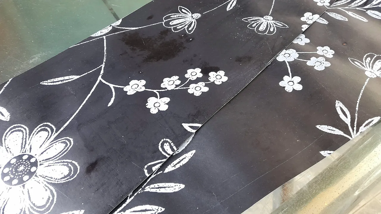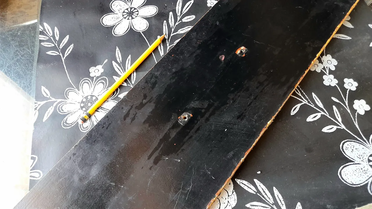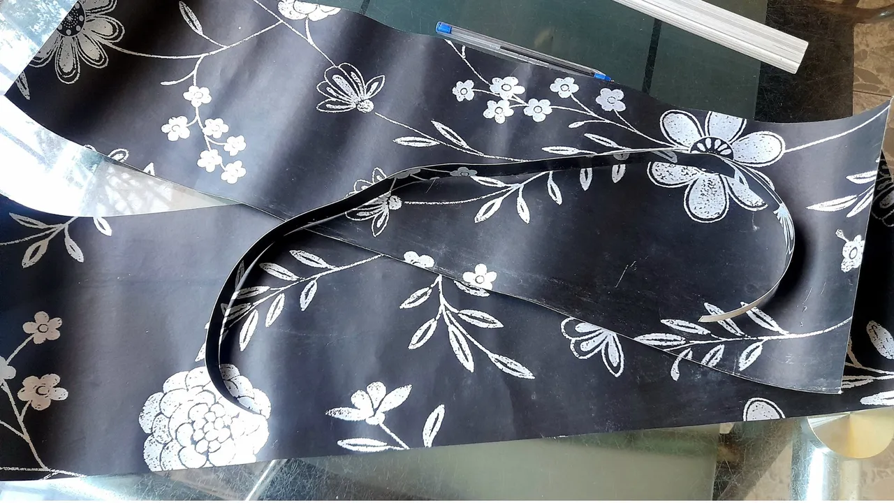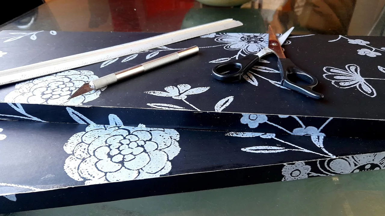 The first thing I did was to mark and cut out on the wallpaper the necessary pieces to cover the boards on all sides, for which I used the ruler and the cutter, in order to obtain neat cuts.
