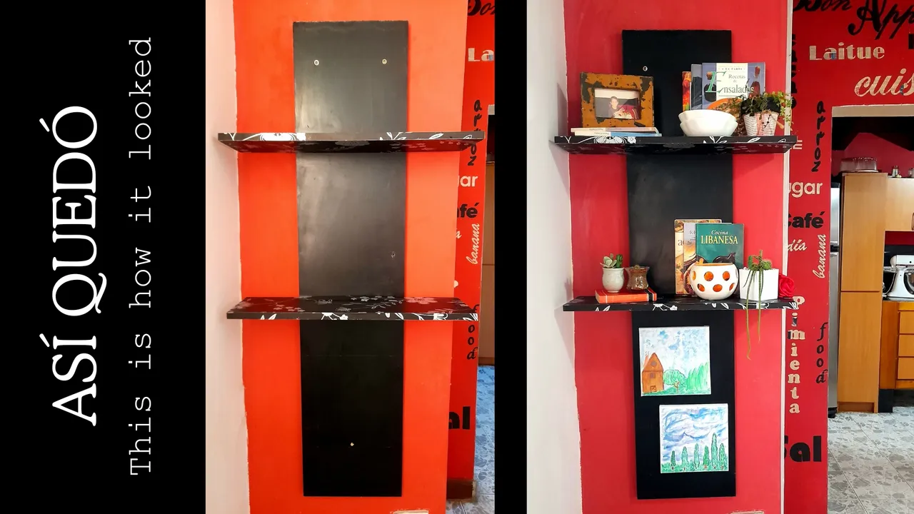 Una vez lista pasó por varios cambios, cosa que no ha parado aún porque cada día le quito o agrego algo, pero solo con respecto a los objetos decorativos, de hecho, justo ahora, tengo por ejemplo libros de recetas de cocina, algunos tazones, objetos decorativos, porta retratos, macetas y unos cuadros hermosos que pintó mi hija Miranda.