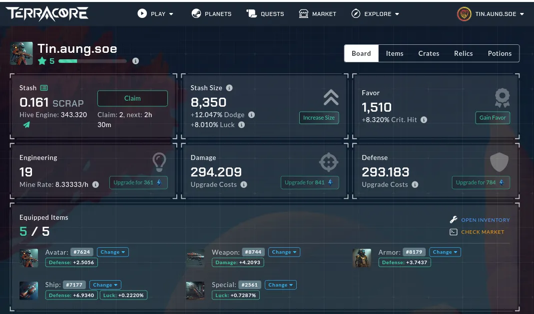 Now my TerraCore Game Stats are Stash Size 8350, Favor 1510, Engineering 19, Damage 294.209, Defense 293.183 and Equipments Horizon Ship, Scanner Droid Avatar, Micro Blaster, Heavy Battle Suit and Torque Wrench.
