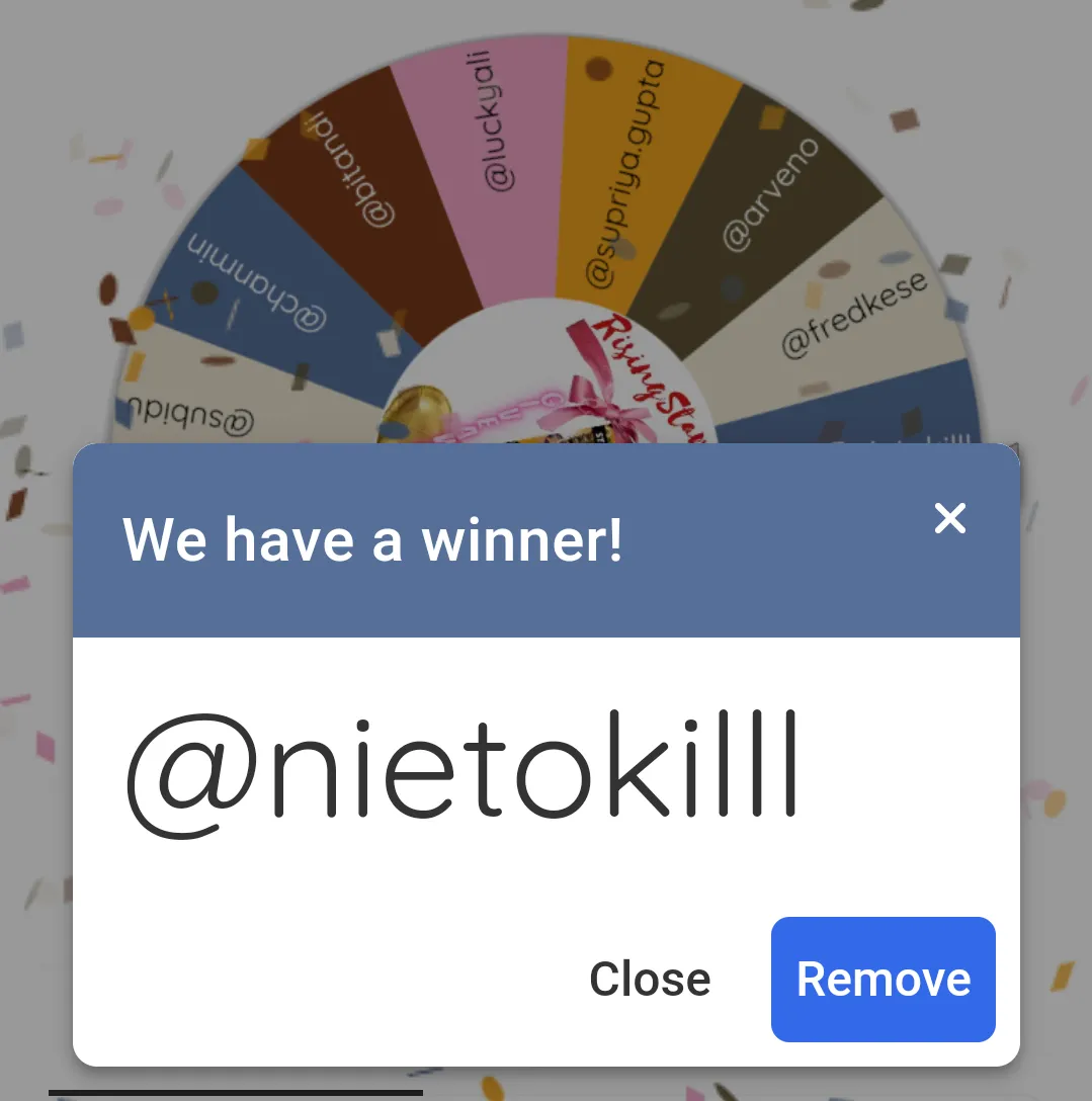 These usernames were typed in https://wheelofnames.com/ Spin Chart and I spinned.