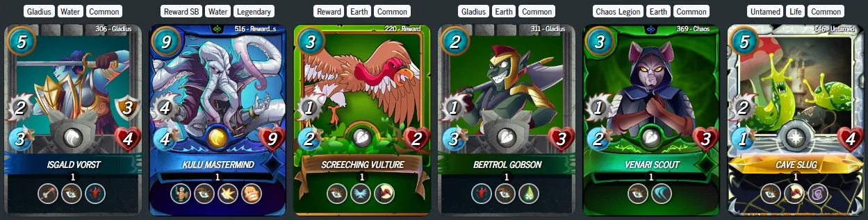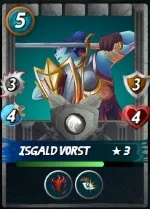 Third Position, Isgald Vorst - No Guild Brawl is complete without including a Gladius Card 😅 Isgald Vorst is a frequently chosen Gladius monster in the Water Splinter due to its affordable mana cost and its impressive destructive capabilities. The combination of the Bloodlust and OPPORTUNITY