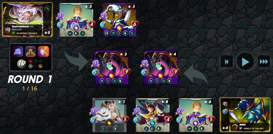 Summoner, Quix The Devious - Because I don't have a better summoner accessible in this situation, I chose Quix the Devious for this match. The +1 Melee/Range from Tarsha/General Sloan respectively are useless in this ruleset as only Magic-type monsters are playable. Both Conqueror Jacek and Grandmaster Rathe are not mana-efficient summoners for low mana capped battle as they each cost 6 mana which will then leave me with only 13 mana for the remaining lineup. Therefore, selecting Quix the Devious with its -1 Speed attribute was my best bet.
