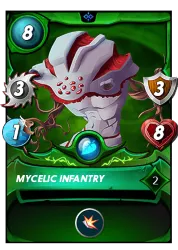 Mycelic Infantry is a heck of a tank - I own a level 2 copy of it, and at that level you get a very respectable 3 attack and 1 speed, paired with 3 armor and an excellent 8 health. To top it off, Mycelic Infantry comes with the Shield ability, meaning that any non-magic attacks it gets hit by will only deal half damage. This makes Mycelic Infantry shine in any battle where you have reason to believe that there won't be much magic damage, though even if there is, 8 health is still a very decent amount of health.