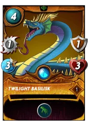 I started off my lineup with my primary and secondary tanks. Djinn Chwala is an outstanding all-around tank - with 5 armor and 9 HP that should buy a lot of time for the rest of my team and Earthquake to deal heavy damage to my opponent's monsters. Twilight Basilisk would add in a bit of additional melee damage at a relatively low cost of 4 mana. Finally, both of these (along with the rest of my team) will benefit from additional dodge chance thanks to the Flying from Brighton Bloom.