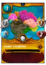 I led off my team with other co-star of the week, Djinn Chwala, along with Hardy Stonefist. Djinn Chwala is a super solid tank, with a robust 5 armor and 9 health. On top of that, Djinn Chwala also has a respectable 3 melee attack, as well as Thorns which will deal counter-damage to any enemy melee monsters attacking it. I used Hardy Stonefish as a budget secondary tank. I was really hoping that it wouldn't be needed, but it could take a hit or two at the front if necessary, as well as helping to defend my other monsters from any monsters on the opposing side with Opportunity. Also, my copy of it is a gold foil - great for getting those bonus rewards shares!