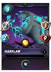 I started off my lineup with a big, bad tank. As I mentioned in the introduction, the Death splinter has some premium tanks, and Harklaw is one of them. His combination of Shield plus a beefy combination of 3 armor and 9 health meant that he should be able to hold up to melee and ranged attacks for a good long time. Oh, and he pitches in on offense too - 2 damage and 2 speed is no slouch!