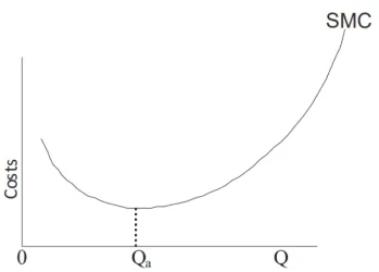 This is an example of a typical marginal cost curve (pulled from Wikipedia). You tend to see initially decreasing costs from economies of scale or higher efficiencies, and then increasing costs as you become constrained by fixed factors of production and otherwise diminishing rates of return. Our optimization point is when marginal cost is exactly equal to marginal revenue (MR = MC). Obviously, in many cases it is difficult to exactly hit that point, but in the real world, our goal is to get as close as possible to it.