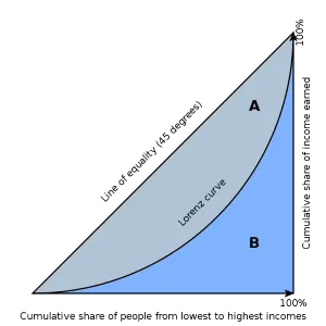 This is an example of a Lorenz Curve (sourced from Wikipedia). The Gini Ratio is the area between the Lorenz curve and line of equality (A) divided by the total area under the Line of Equality (A+B). An economy with evenly distributed wealth will have a Gini Ratio of 0, and an economy with perfectly unevenly distributed (i.e., all assets held by a single individual) would have a Gini Ratio of 1.