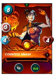 I closed out my team with some more ranged damage. Ash Mirage is a solid attacker with 2 damage and 5 speed, and its Headwinds ability would tilt the tide in my favor if my opponent happened to bring some ranged attackers into the fight. I finished with Countess Sinash, who could safely hide in the back with Camouflage, and would be able to take out my opponent's weaker monsters whenever the Opportunity strikes.