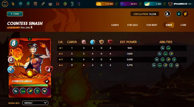 Countess Sinash's stats are quite decent for an 8 mana cost unit. Even if her damage and speed is high, her health is only 4 making it deadly to use. However, this weakness is covered by her Camouflage ability making it even. |