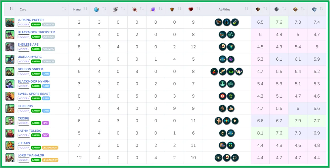 This image is taken from the platform called Splinterguide, which has very good information about all the existing teams and editions in the game, but the most interesting thing I see is the score that is given to the cards in each league, this number represents the effectiveness of the unit in that league, this effectiveness is measured with the numbers from 1. 0 to 10, taking into account that, if the card has a score of 5.5 or lower, the box will be red and therefore its effectiveness is not so good in that league, on the other hand, if it is 5.6 or higher, it will be green, which indicates that, it could work well, the higher the number, the better the card is in that league.
