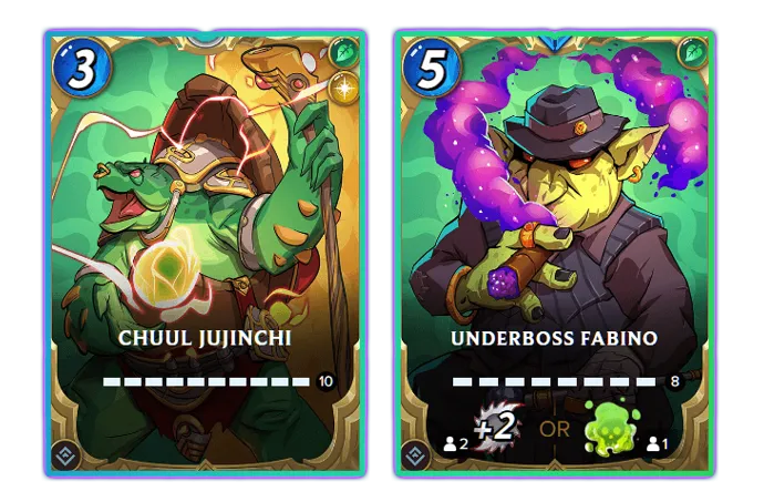 Underboss Fabino: Este invocador forma parte también de lo que es una nueva mecánica en el juego, me refiero a las “Tácticas de Invocador”, la cual se puede activar después de presentar nuestra "Estructura de Juego” en el campo de batalla, y en la que tenemos 2 opciones a implementar, por ejemplo, al jugar con esta carta podemos elegir después de la formación 2 unidades de nuestro lado del campo o del adversario para que tengan +2 puntos de ataque de cuerpo a cuerpo, y una unidad la cual, tendrá la posibilidad de envenenar al rival cuando ataque, o al menos es así como lo entiendo, este no está nada mal, ambas habilidades pueden cambiar de forma radical el curso de una batalla, y más si se puede activar después de presentada la alineación.