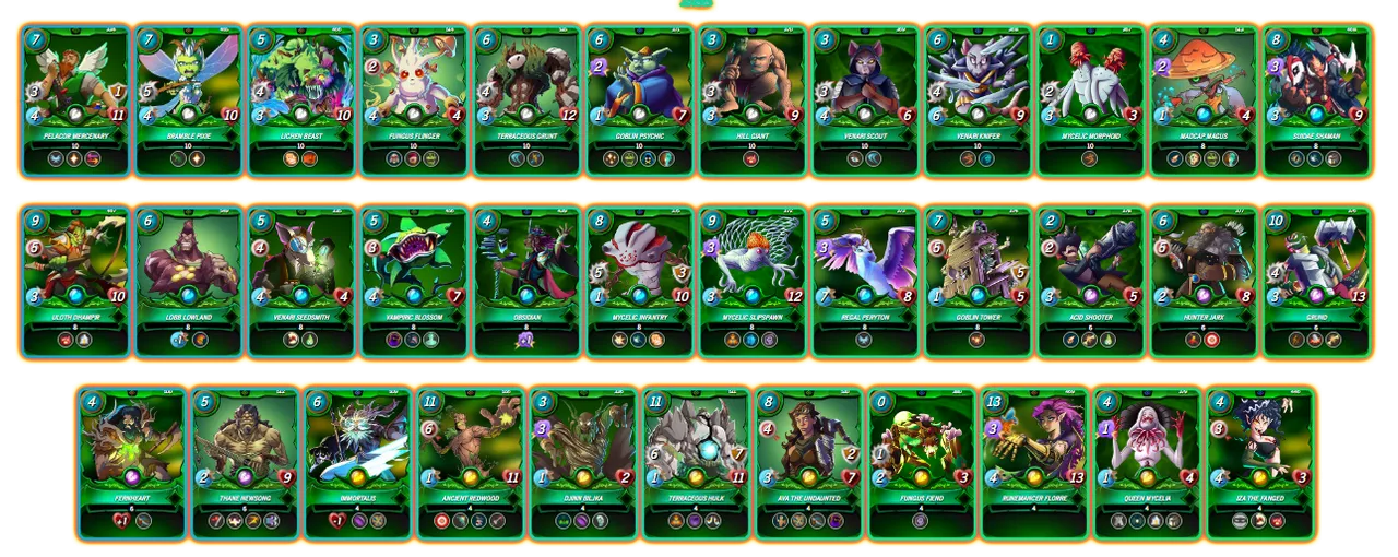Chuul Jujinchi: This is one of the new "Summoners" from "Rebellion" for the "Earth Splinter", and it brings with it one of the new mechanics introduced in the game which is the possibility of using 2 elements, which is great, however, the only real benefit is just that, using 2 splinters, in this case combining "Earth and Life", but, it doesn't have more positive aspects which is what I don't like, since, many times what makes a difference is a summoner that can increase the stats of the cards, the good thing is that it only has 3 mana points like the old "Alpha, Beta and Untamed" summoners.