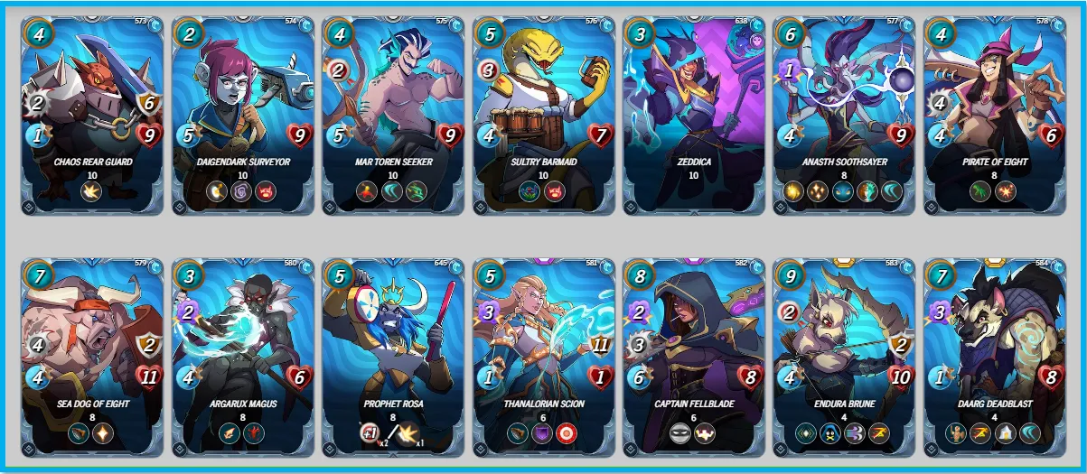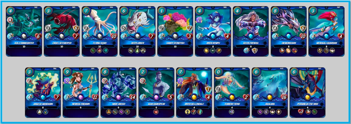 El SET de agua de la anterior edición llamada “Chaos Legion”, está compuesta por 17 cartas, si podemos ver que hay carta que incluso muchos de nosotros utilizamos de forma recurrente, pero, hay otras que verdaderamente están ausentes en el “Meta” actual, inclusive antes de la salida de “Rebellion”, por lo que, sinceramente no creo que, este SET de “Chaos Legion” del equipo de agua, sea mejor que el “Rebellion”, puedo llegar a esta conclusión solo observando las características principales de estas cartas, y si vemos la combinación de habilidades, pues, como ya dije anteriormente, solo algunas se utilizan, otras quedan en el olvido y se completa con otras cartas de los splinter combinables, como “Neutral y Dragon”.