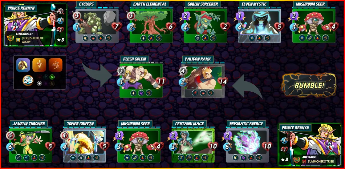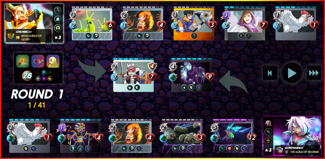 This battle was incredible, highlighting that this was the guild that came in first place for this cycle, but, being more concentrated and wanting to at least win a battle, I did not pay much attention to the rules, the only thing I concentrated on was to place cards with the least amount of speed possible, this would help me to get ahead in the attacks, since "Reverse Speed" was active, in any case, I wanted to apply a strategy that I had already done, so I focused on playing 2 slow cards with the "Opportunity" ability, placing a couple of "Support" cards plus other support cards and selecting one of my favorite summoners such as the great "Chanseus the Great", which would help me to protect myself and give me time in case some of my cards were defeated, which turned out very well.